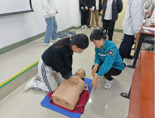 讲座中,急救中心工作人员王苗苗通过分发急救宣传手册,详细阐述了拨打120的具体情境,并以“说三做四”的方法总结了正确拨打120的要点,同时进行场景模拟,以直观方式展示拨打过程中的常见误区和注意事项。随后,张金霞以幽默风趣又不失严谨的语言开展题为“关爱生命,救在身边”的主题报告。她重点讲述了心肺复苏和海姆利克急救法,介绍了如何把握“黄金时间”进行有效应急救护,让在座同学们全方位、更直观地感受和掌握急救要领。最后,急救中心的专业人员现场进行示范,学生们积极参与实际操作,通过亲身体验进一步加深了对急救方法的理解和掌握。