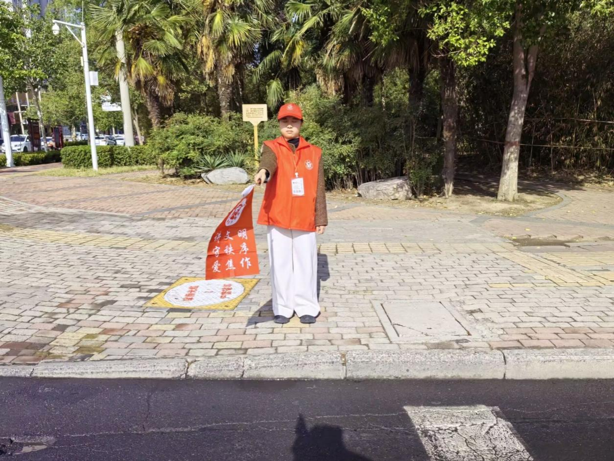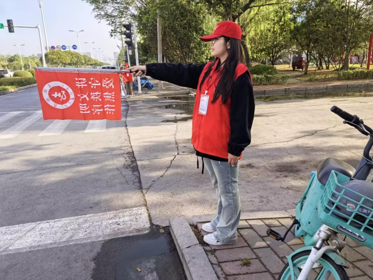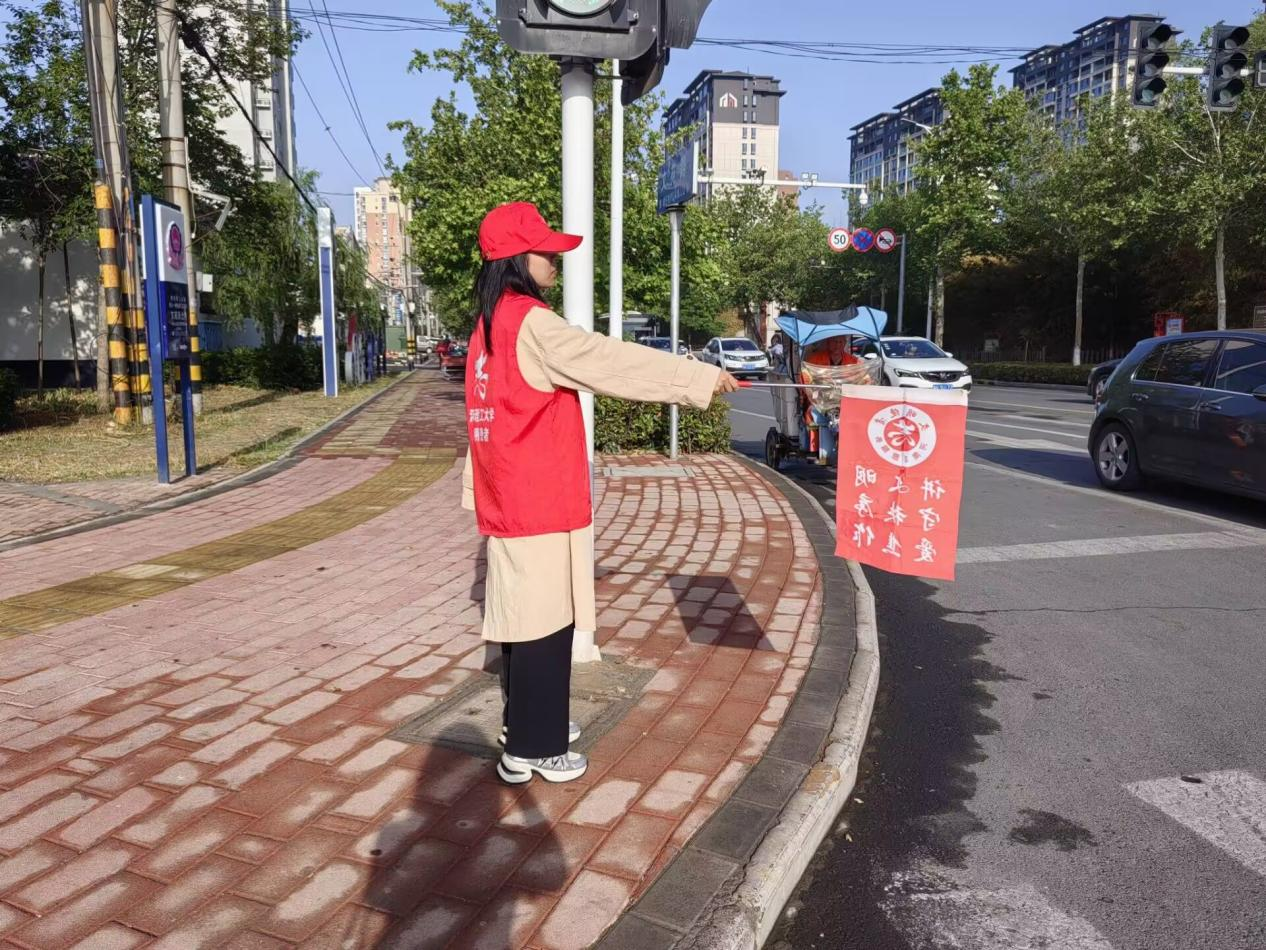 活动伊始,校园西门便成为文明传递的“起点站”。志愿者们身着统一志愿制服,头戴“文明使者”标识帽,手持鲜艳引导旗列队亮相。他们目光如炬、身姿挺拔,以饱满的精神风貌开启这场与城市文明的“双向奔赴”。随后,志愿者兵分多路,奔赴两大核心十字路口及四个分支路口。在川流不息的街头,一套创新的“旗帜模拟法”成为文明引导的亮点:红蓝两色旗帜化身为移动信号灯——红灯旗落下时,如同一道静默的“安全闸”,示意行人暂停脚步;绿旗扬起时,恰似一声清脆的“出发令”,引导有序通行。这一充满创意的互动方式吸引众多市民驻足参与,大家在趣味模拟中亲身体验交通规则的“指挥密码”,让安全意识从“耳听”变为“手触”的深刻认知。