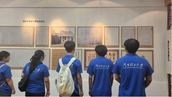 走进河南理工大学北校区校史馆,泛黄的校史文献、珍贵的历史照片,生动再现了我校自1909年创办以来,在烽火岁月中坚守教育初心的奋斗历程,让成员们深刻感悟到红色校史中蕴含的奋进力量,对“明德认责”校训、“好学力行”校风有更加深刻的认知。每一个催人奋进的历史事迹,都激励着团队成员勇毅前行,坚定理想信念,争做时代红色基因传承者,以实际行动践行新时代青年的责任与担当。