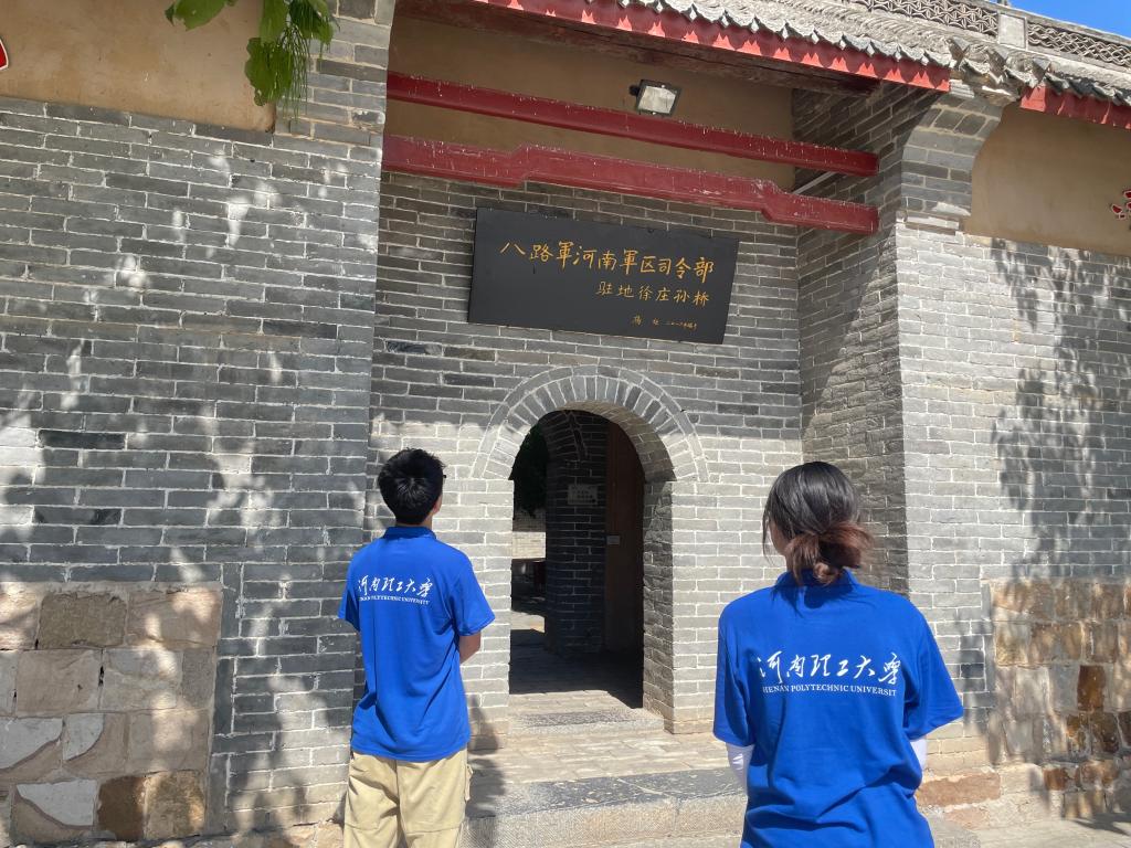 实践团抵达孙桥村,在村委会委员唐青峰的带领下前往徐庄镇孙桥村的中共河南区党委八路军河南军区驻地旧址进行调研红色革命文化。在旧址前的广场上,实践团成员怀着无限敬仰心情,面向国旗庄严地唱国歌,行注目礼,深切缅怀革命先辈的丰功伟绩。接着,实践团走进旧址,大家认真阅读史料,驻足端详陈列室内的图片版块和实物,仔细聆听王树声、杨炬、皮定均、徐子荣等党政军领导人运筹帷幄与日寇进行艰苦斗争的光辉历史。每一张图片、每一个实物、每一场战役,都真实记录了共产党人艰苦奋斗的历史画面,实践团成员身临其境地感受到革命先烈们前赴后继、不惧牺牲、英勇顽强的伟大抗日斗争精神。