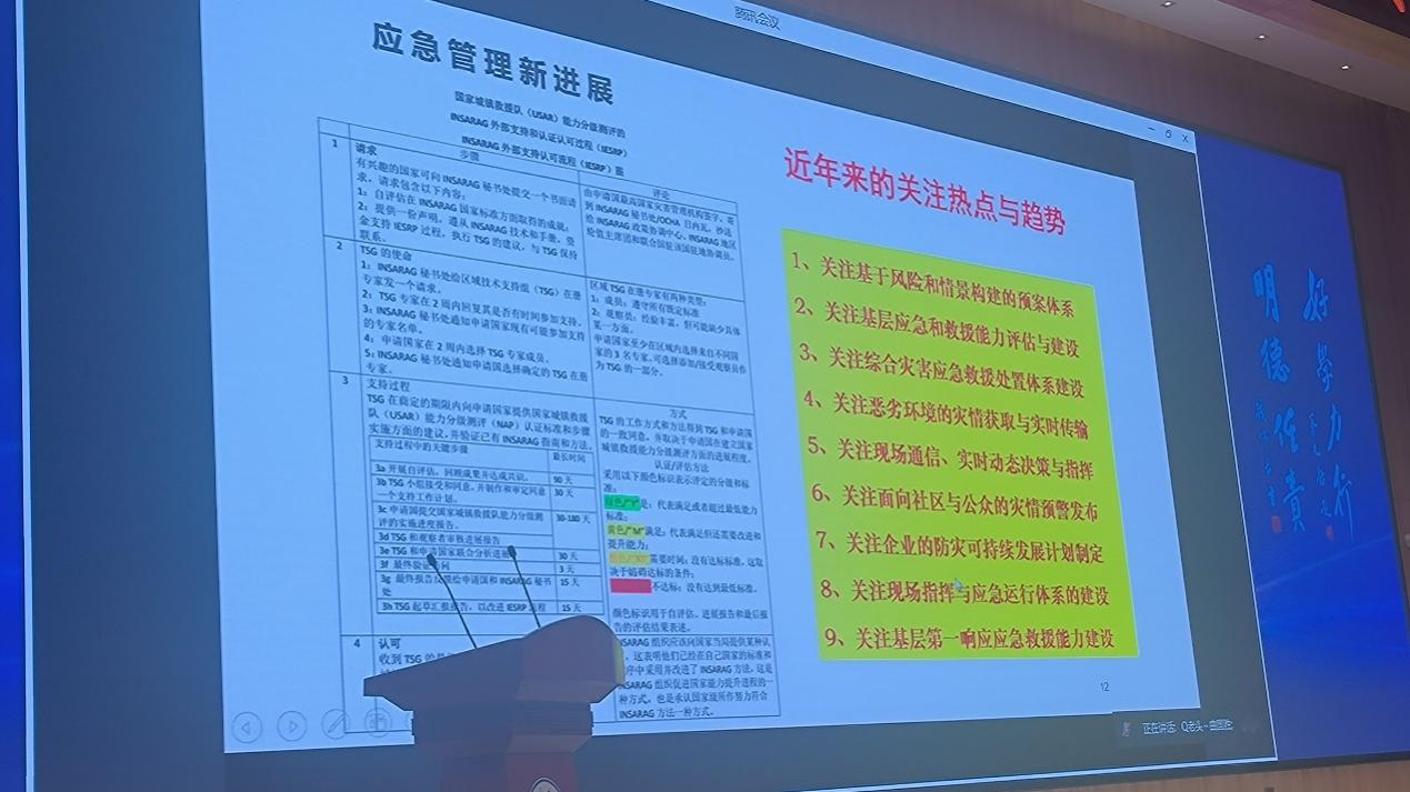 中国地震应急搜救中心原总工程师曲国胜以“应急管理进展与能力建设”为题,探讨了应急管理四阶段理论:减灾、备灾、恢复、响应,对救援能力建设的新动向以及国家“十四五”应急体系规划进行了总结,并结合土耳其7.8级地震应急响应与救援处置的具体案例,揭示强震应对存在的短板以及措施建议。