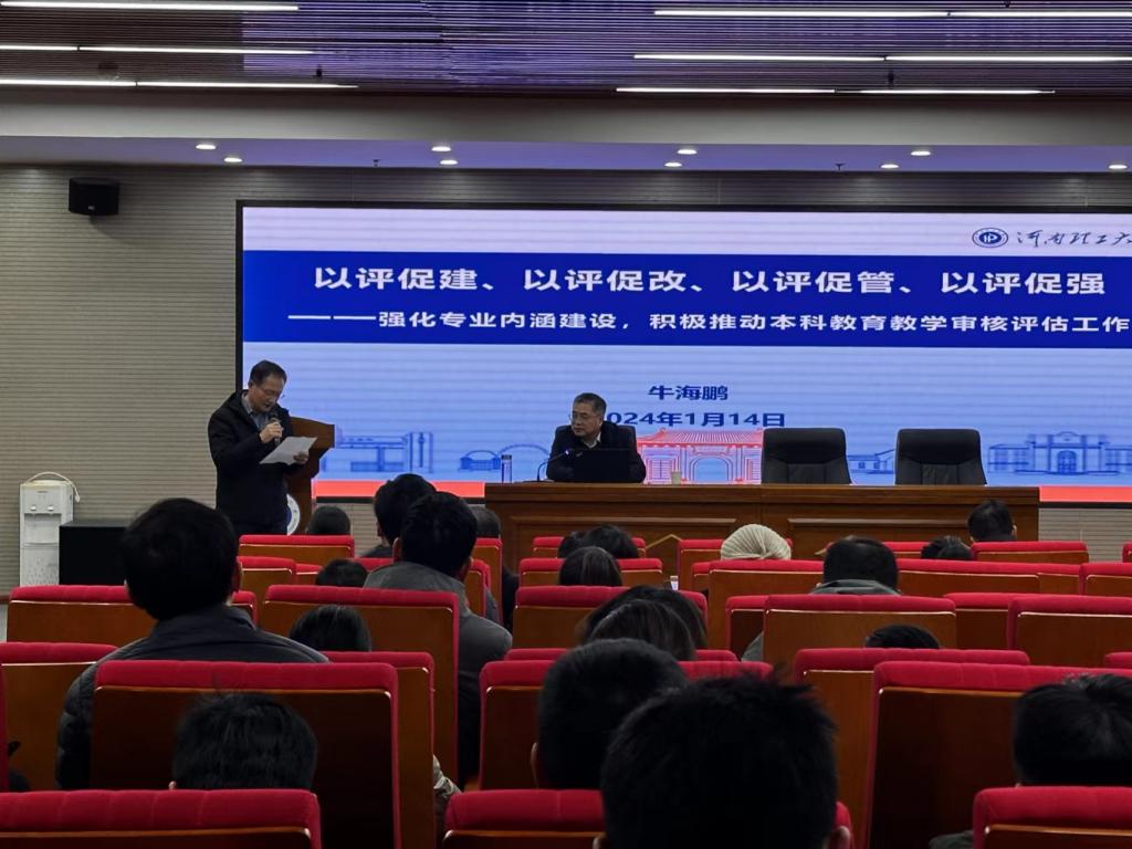 本次培训的主题是“以评促建、以评促改、以评促管、以评促强——强化专业内涵建设,积极推动本科教育教学审核评估工作”。报告会上,牛海鹏教授围绕“新一轮审核评估概况”“评估基础”“专业建设面临的问题挑战与持续改进”“审核评估工作进展”“审核评估存在的问题及下一步工作打算”“结语”等六大部分进行讲解,厘清了河南理工大学本科教育教学工作开展的整体情况,为学院扎实推进新一轮审核评估工作提供了行动指南。他指出,新一轮本科教育教学审核评估是贯彻落实习近平总书记关于教育的重要论述的重要举措,是推进河南理工大学深化教育教学改革的一次大好机遇。