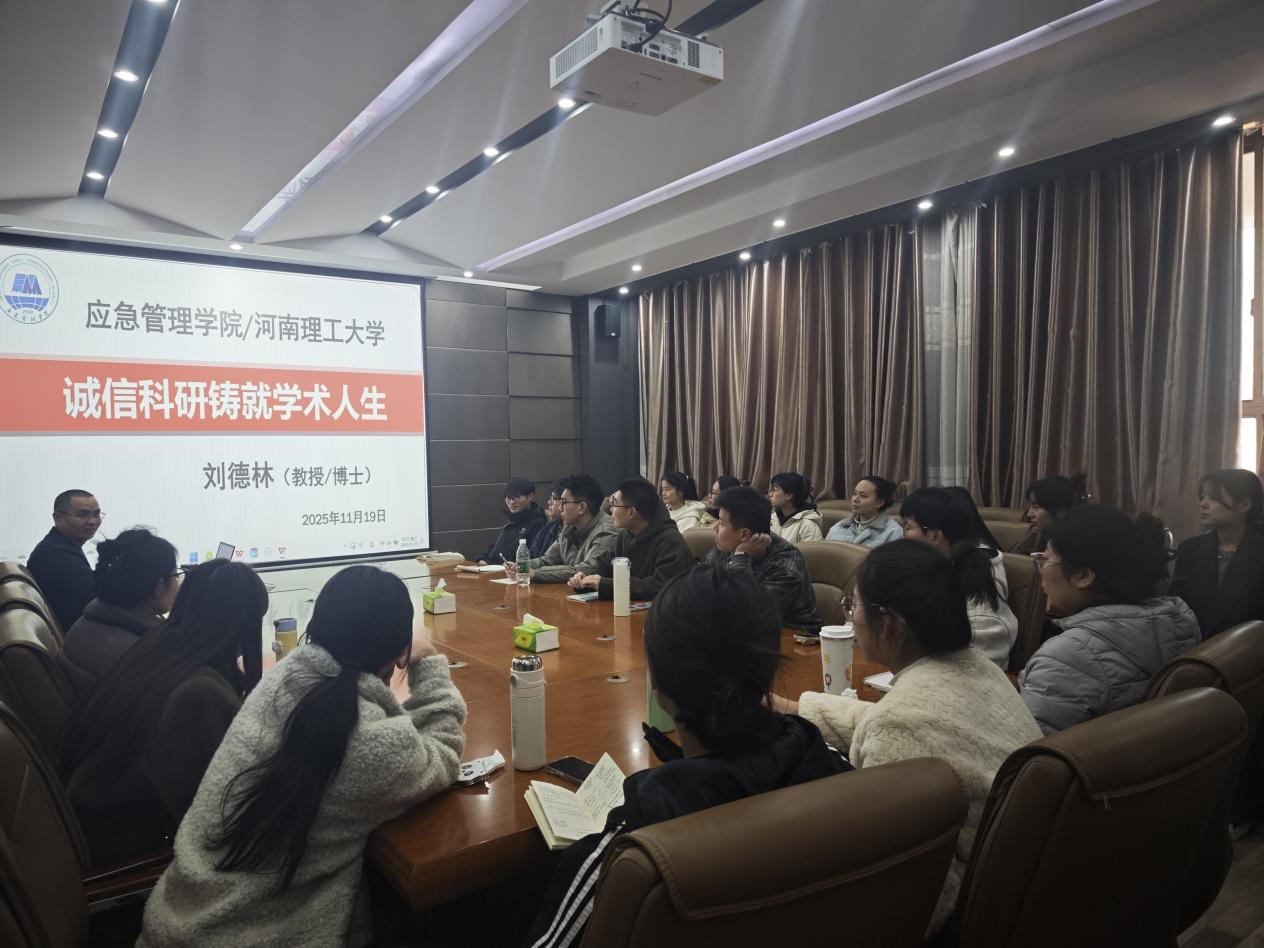 11月19日下午,应急管理学院在文综楼518室组织召开研究生学风建设专题讲座。本次讲座以“诚信科研铸就学术人生”为主题,由我院刘德林教授担任主讲人,全体全日制研究生参加。