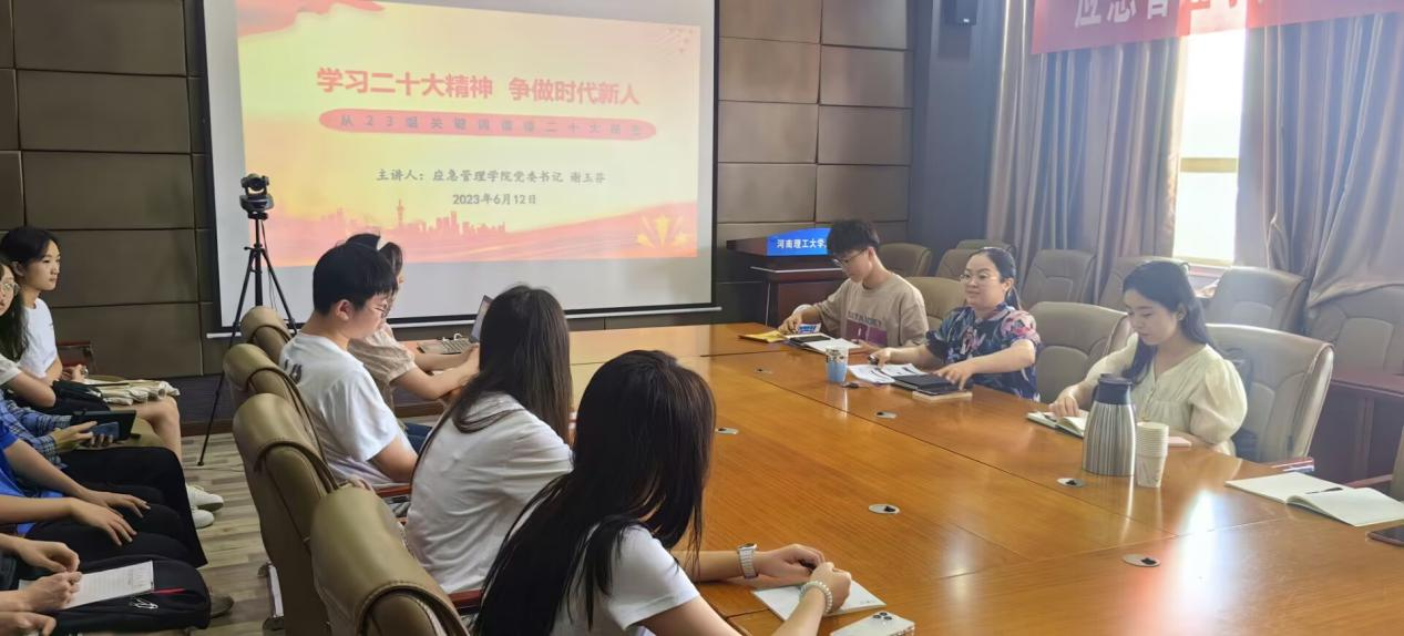 6月12日下午,应急管理学院党委书记谢玉芬在文综楼518会议室为2022级学生代表讲授“学习二十大精神,争做时代新人”专题党课。