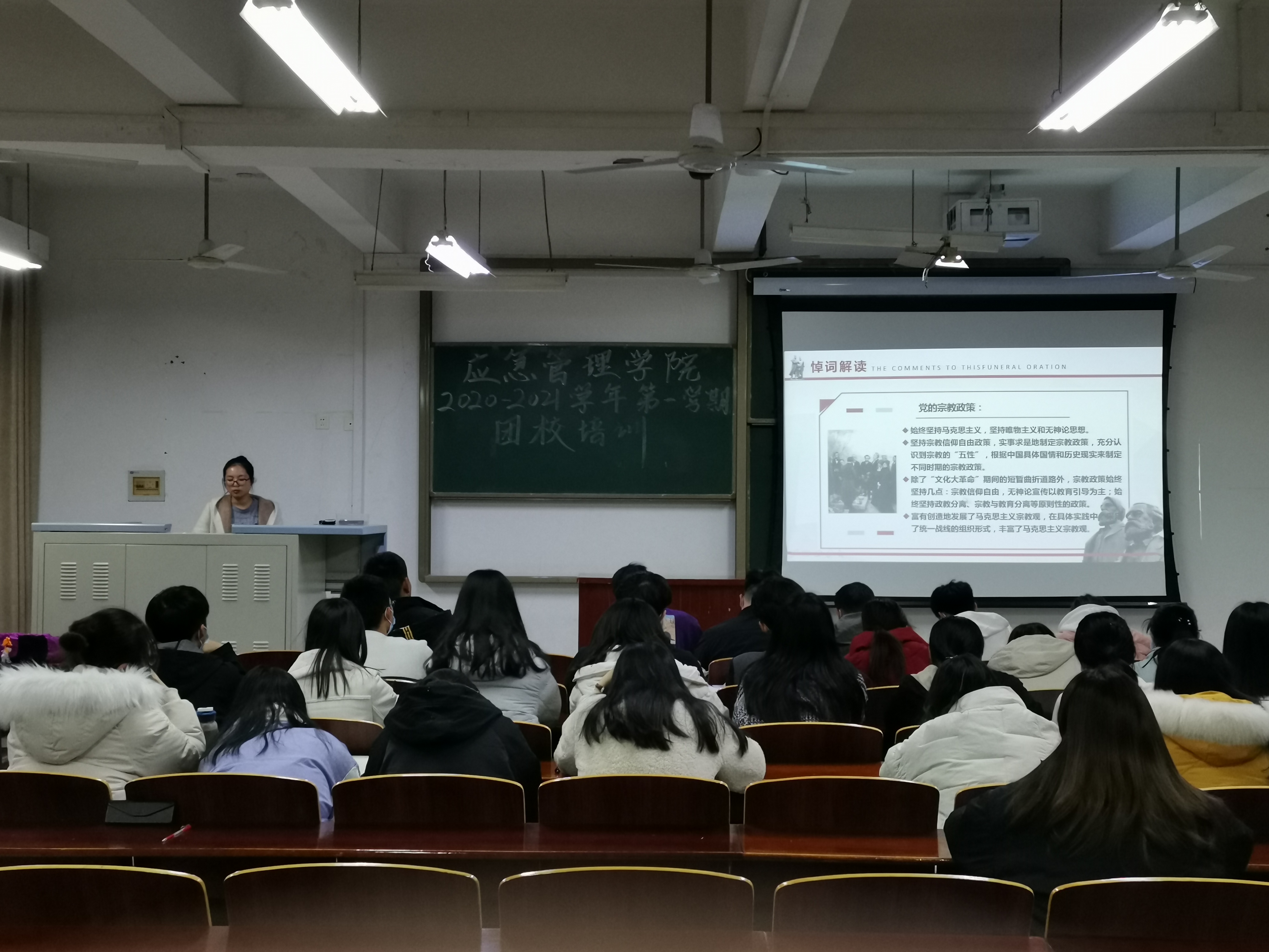 11月28日晚,应急管理学院于文综楼509教室举行“马克思主义宗教观学习”主题团校培训。此次培训由学生会主席周淑君主持,全体新任团学干部参加培训。