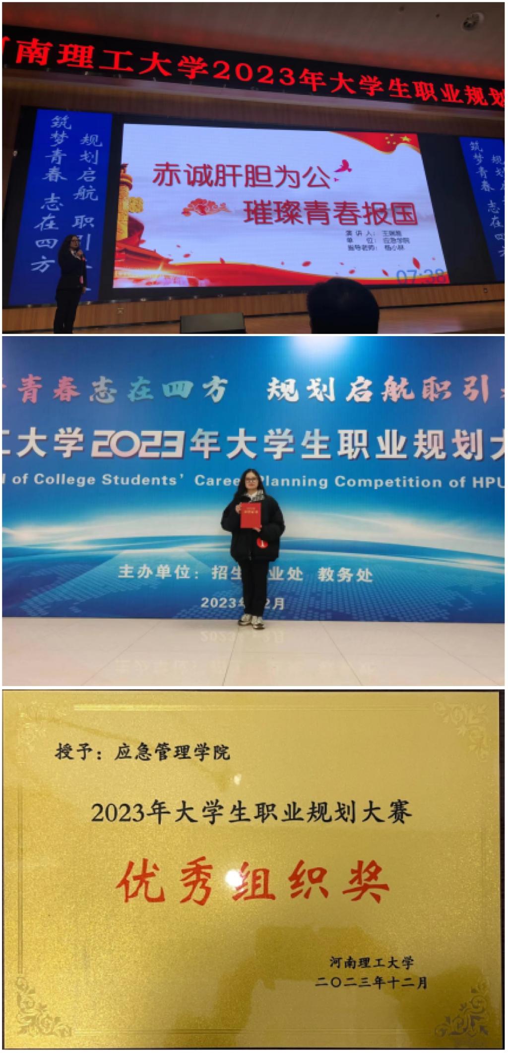 为增强大学生生涯规划意识,促进毕业生高质量充分就业,12月17日,由招生就业处、教务处主办的河南理工大学2023年大学生职业规划大赛决赛在南校区第二图书馆学术报告厅A厅顺利举行。我院精心组织学子参与,取得优异成绩。