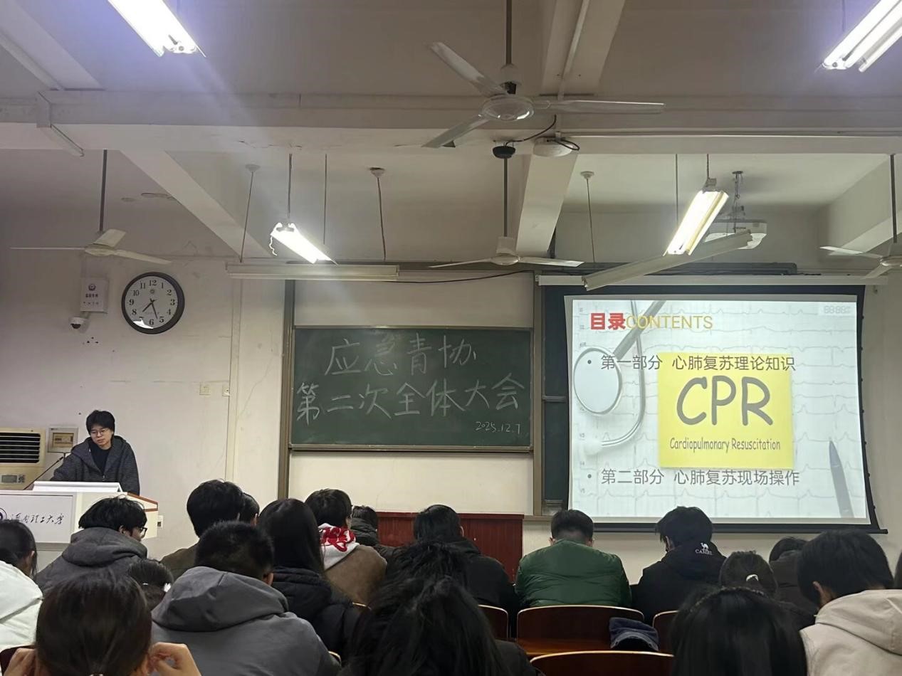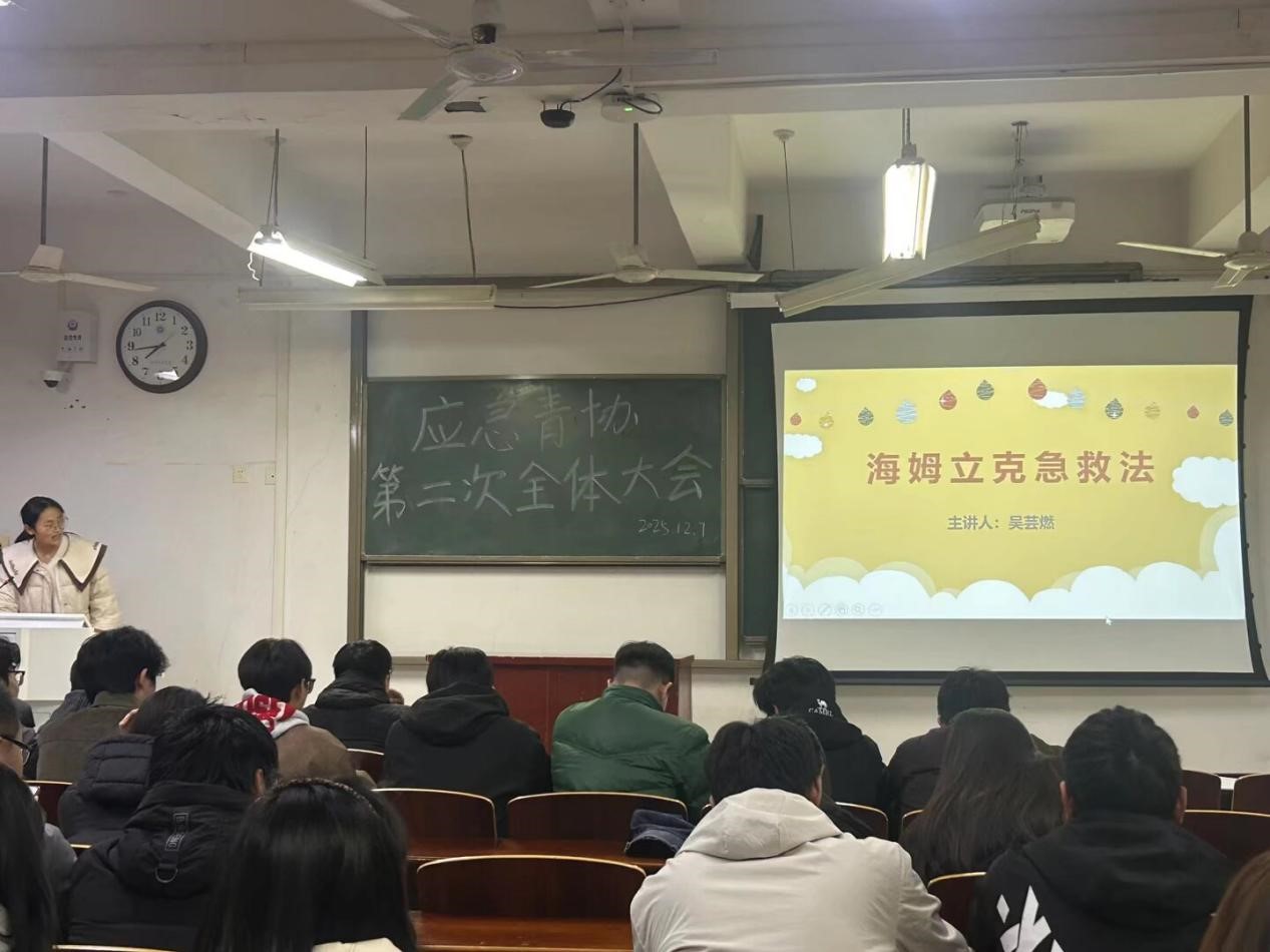 活动伊始,应急青协负责人以近年国内多起气道异物梗阻、心脏骤停的真实案例为切入点,通过PPT课件图文并茂地剖析了此类突发状况的高发场景与严重危害。讲解中,会长着重强调了“4分钟黄金急救时间”的关键性,用直观的数据和惨痛的案例,让在场干事们深刻认识到掌握基础急救知识的紧迫性,迅速将现场学习氛围拉至高潮。在核心知识讲解环节,宣讲人将内容划分为“海姆立克急救法”和“心肺复苏操作”两大模块展开教学。针对海姆立克急救法,课件清晰呈现了成人、儿童、婴儿及自救的不同操作步骤,精准标注出按压部位、发力方向等核心要点;在心肺复苏板块,宣讲人不仅拆解了环境评估、意识判断、胸外按压、人工呼吸的完整流程,还明确了胸外按压5-6厘米的深度、100-120次/分钟的频率等专业操作标准。面对干事们提出的“非专业人士能否贸然施救”、“按压失误的后果”等疑问,宣讲人结合专业知识逐一细致解答,进一步扫清了大家的认知盲区。“这种纯知识宣讲的形式干货很密集,能快速搭建急救知识框架,以后遇到突发情况也能多一份底气。”参与活动的一位干事分享道,在场干事们均表示此次宣讲收获颇丰。宣讲活动落幕之后,应急青协还针对各部门小干事开展了专项能力培训,其中文宣部聚焦新闻撰写技巧开展专题授课,助力小干事提升活动宣传的专业度。
